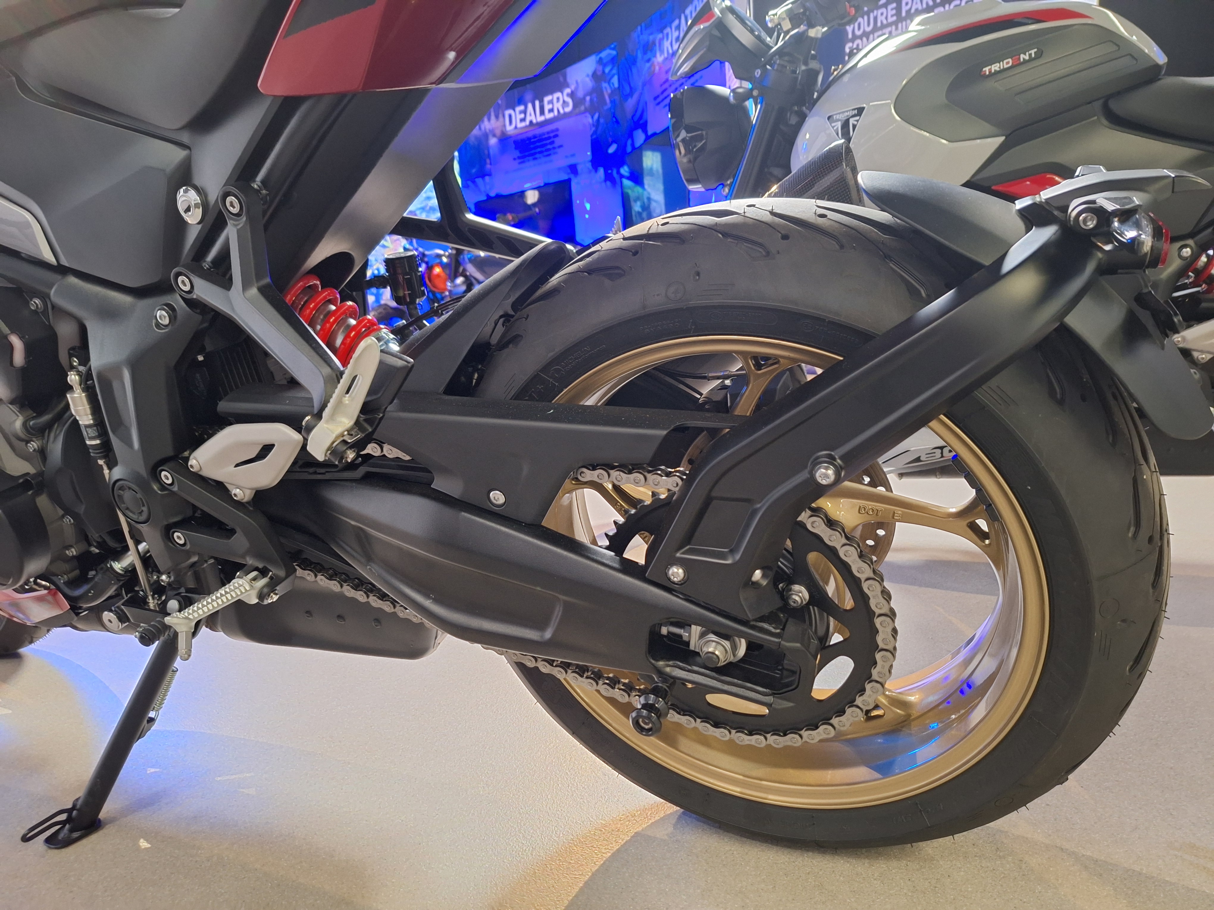 Mécaniquement, la Trident 800 embarque le tout nouveau moteur trois cylindres de 798 cm3 de Triumph, développant 115 chevaux à 10 750 tr/min et un couple maximal de 84 Nm à 8 500 tr/min. Le moteur est équipé d’un vilebrequin forgé par torsion, d’un arbre à cames et d’un arbre d’équilibrage unique, de bielles forgées et de pistons à haute compression, tous conçus pour maximiser les performances et la durabilité.